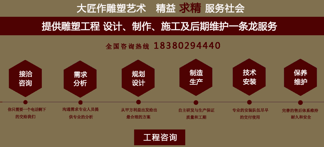 成都大匠作雕塑有限公司,是經成都工商局審定注冊的正規(guī)專業雕塑制作及工程安裝服務機構,是由一群年輕富有朝氣的年輕人創(chuàng)辦,發(fā)軔于四川省成都市龍泉驛區。它是一家******于創(chuàng)作、制作和銷售為一體的公司。大匠作擁有多年從事公共藝術的專業人員和雕塑制作人組成的核心團隊,為您提供專業、具創(chuàng)新的設計及制作服務。公司成立以來,秉承“******服務、誠信為本”的宗旨,以客戶需求為目標導向,不斷學習,進取,優(yōu)化和提高服務質量,公司向您******——“您的滿意***是我們的信譽”,我們將以飽滿的熱情和******的服務贏得您的贊譽和支持。
